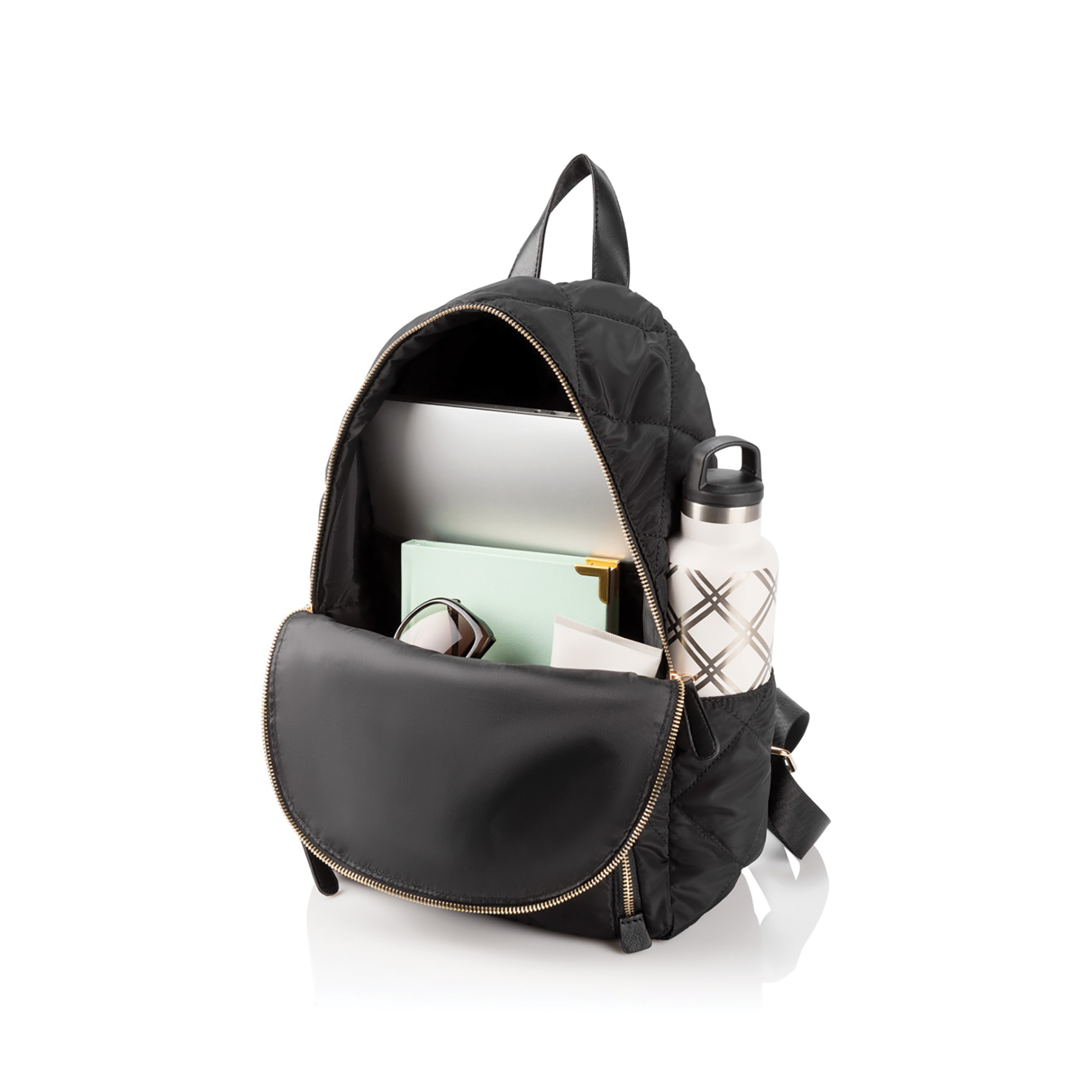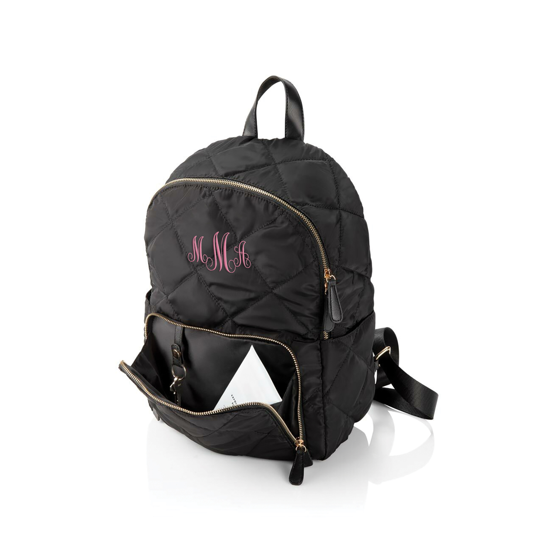 The Black Nylon Backpack is made of soft, quilted nylon and features quality gold hardware. A laptop slot, multiple interior pockets, and a keyring make this bag both practical and stylish. The bold embroidered personalization creates a truly one-of-a-kind look!