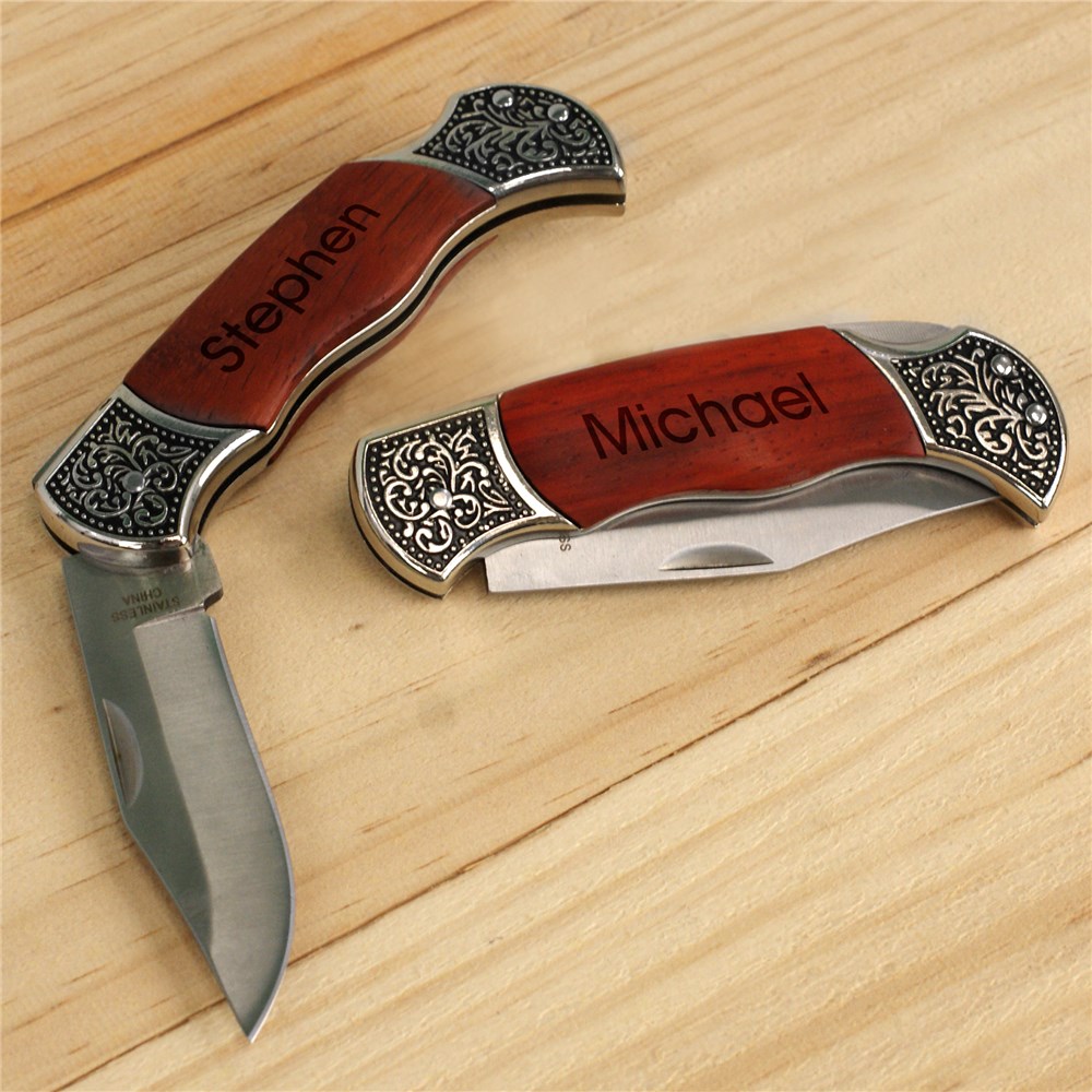 Our beautiful engraved hunting knife would make an excellent personalized gift idea for Dad, Uncle and even for groomsmen! The hunters in your family or wedding party will be impressed by the beauty of this accessory. This DecoGrip Hunting Knife features a Rosewood handle, locking three inch blade when open, and a beautiful decorative handle. It measures 4 1/2" x 1 1/2" x 1/2" folded. Free personalization on these groomsmen knives is included. We will skillfully engrave any name onto the handle.
