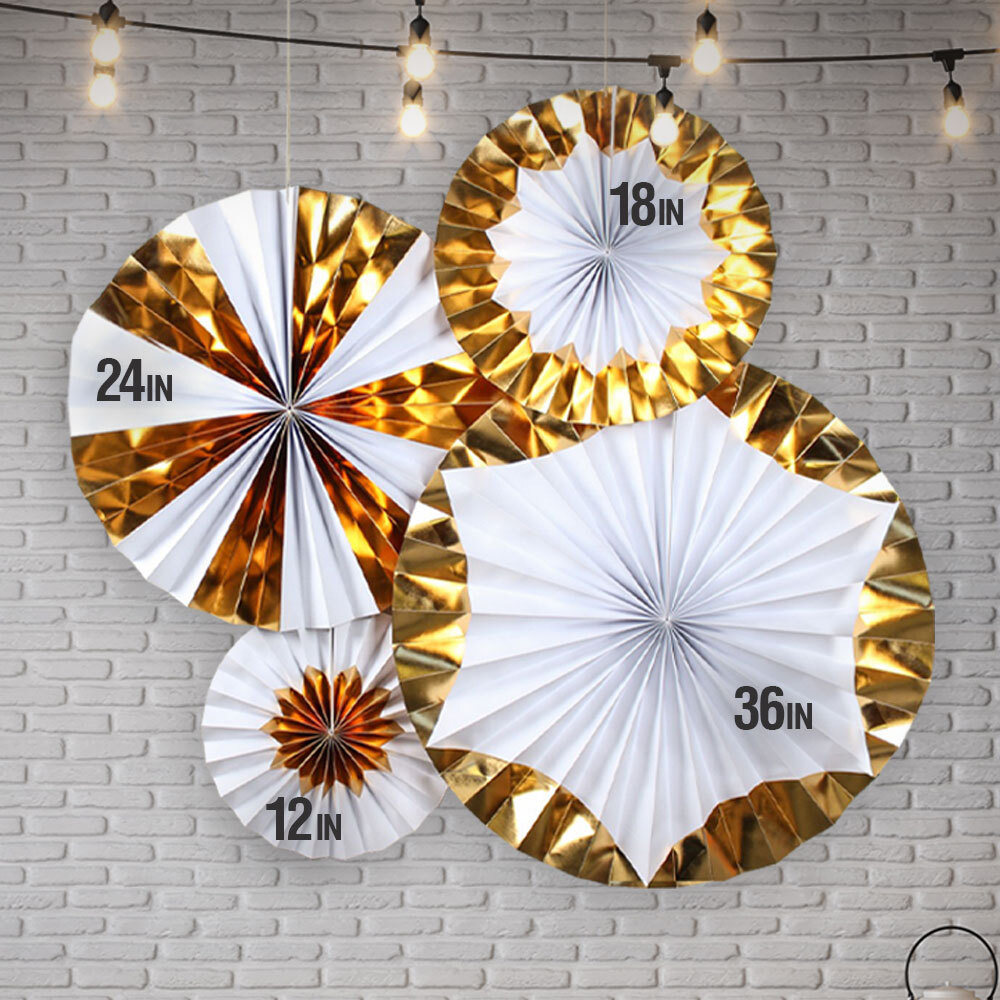 These giant pinwheel wedding decorations won't cease to awe at your event. The pinwheels come in 4 different sizes, and come in a multicolor or gold assortment. The multicolored assortment is embellished with lustrous gold foil and pinstripe pattern, and gold assortment comes in a variety of gold foil and white patterns. Try hanging them from the ceiling or putting against a wall. These unique pinwheels are sure to catch everyones eye.